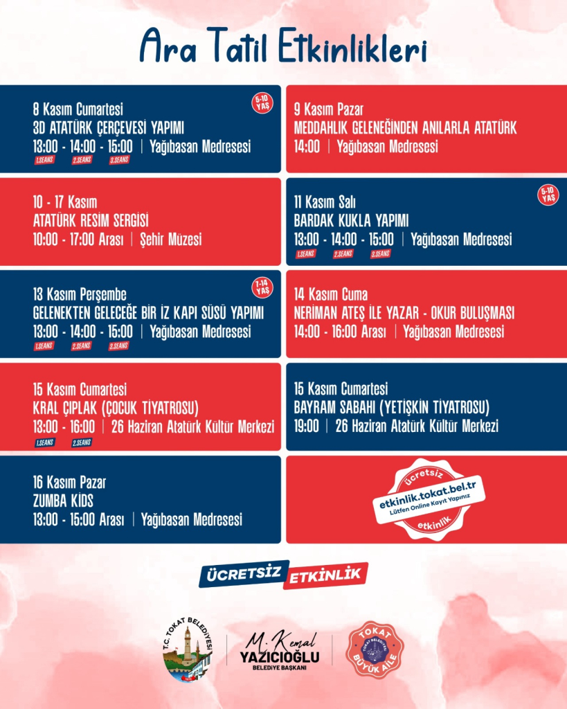 Tüm etkinliklerin ücretsiz olarak gerçekleştirileceği programda 8 Kasım, 11 Kasım ve 13 Kasım tarihli etkinliklere katılımlar için etkinlik.tokat.bel.tr adresi üzerinden online kayıt yapılabilecek.
