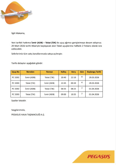 Yeni hat, Tokat — İzmir arasında direkt ulaşımı kolaylaştıracak; yolcular biletlerini Pegasus’un resmi kanallarından satın alabiliyor.